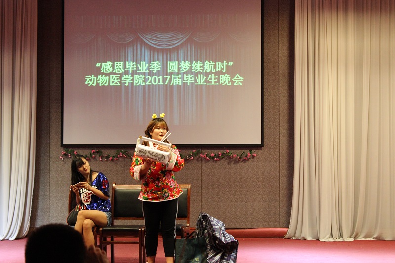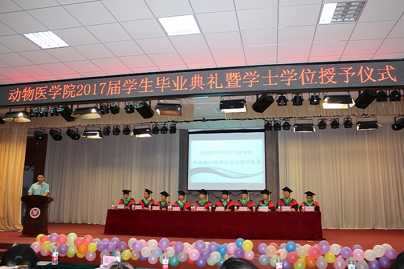 6月7日,动物医学院在大学生活动中心举行2017届学生毕业典礼暨学士学位授予仪式。教务处处长边传周、实验研究中心副主任向瑞平,该院党总支书记王春明、省猪病工程中心主任李文刚、党总支副书记张瑞春,副院长石冬梅、宋予震等领导老师出席典礼活动并为141名本科毕业生拨苏正冠、颁发学位证书。