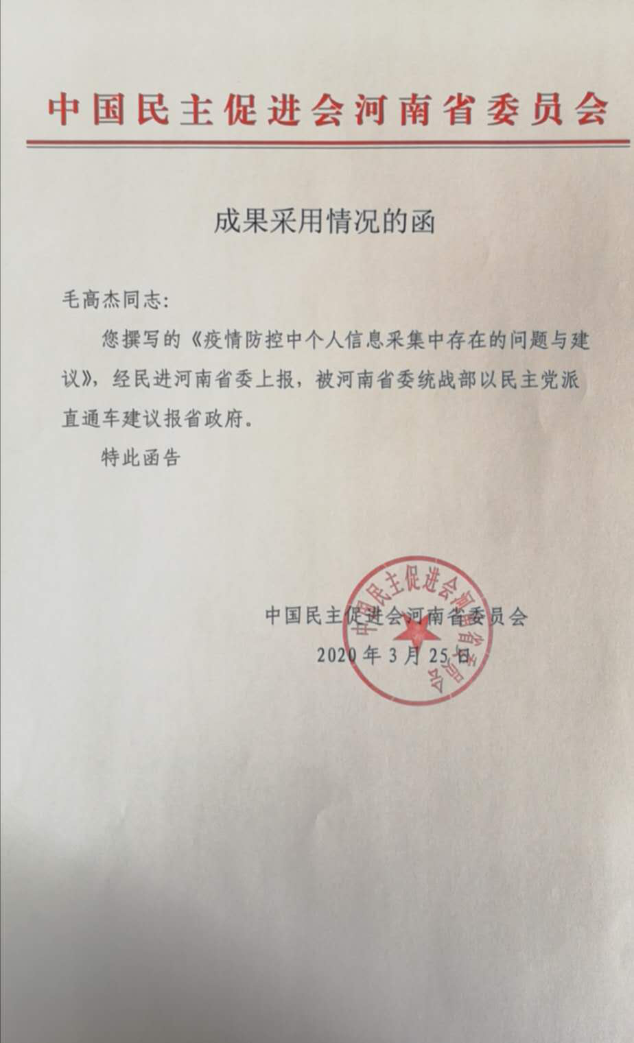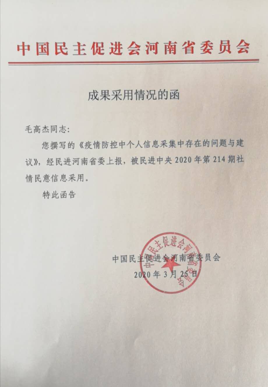近日,从民进省委传来消息,我校民进副主委毛高杰博士撰写的《疫情防控中个人信息采集的问题与建议》被民进中央采用,同时被省委统战部以民主党派直通车方式上报省政府。