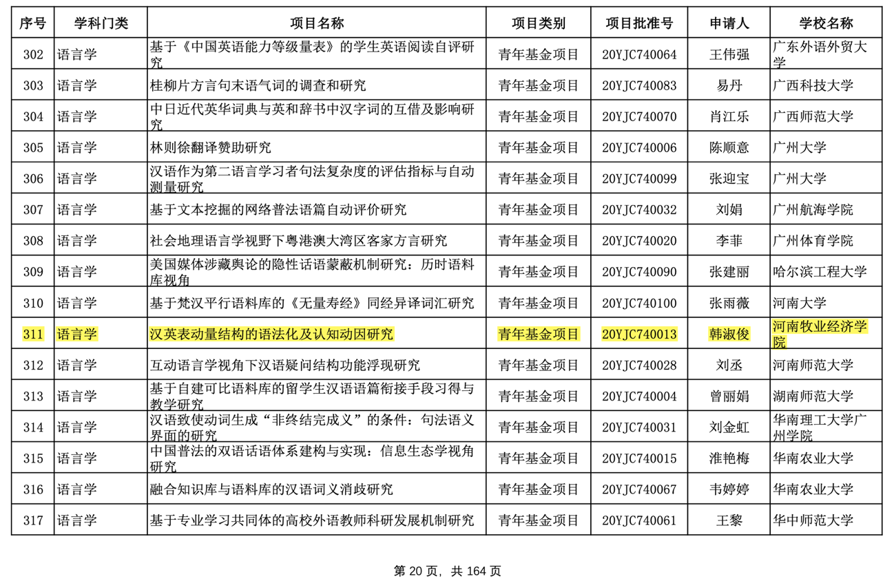 3月20日,教育部社科司公布了2020年度教育部人文社会科学研究一般项目立项名单。我校外国语学院青年教师韩淑俊博士主持的“英汉表动量结构的语法化及认知动因研究”喜获立项。