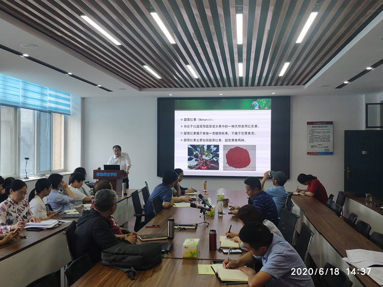 雒秋江认为从天然植物中寻找具有抗肿瘤作用的成分,是研发新抗肿瘤药物的途径之一。围绕植物提取物-甜菜红素,雒秋江分享了团队就甜菜红素抗肿瘤功能的最新研究成果。报告首先较系统的介绍了甜菜红素的来源、理化性质、代谢吸收途径,随后介绍了甜菜红素的抗肿瘤功能。雒教授团队通过开展体内和体外试验研究,发现甜菜红素可显著抑制人宫颈癌HeLa细胞和荷瘤裸鼠肿瘤生长,可能与甜菜红素抑制癌细胞乳酸脱氢酶5的活性有关。报告结束后,听会人员就甜菜红素的应用前景、抑制肿瘤细胞增殖的机理等方面与雒教授展开了热烈讨论。