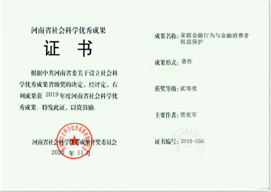 近日,2019年度河南省社会科学优秀成果奖评审结果正式公布,我校金融与会计学院副院长贾宪军博士荣获二等奖。