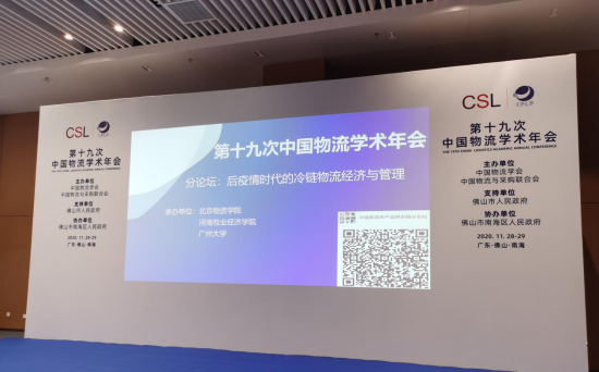 11月28-29日,由中国物流学会、中国物流与采购联合会主办的第十九次中国物流学术年会在广东省佛山市南海区召开,中国物流学会副会长、常务理事、理事、特约研究员和会员代表,来自全国物流领域政产学研各界专家、学者、企业家、院校、研究机构及媒体代表共900余人参加了会议。我校物流与电商学院与北京物资学院、广州大学联合承办了“后疫情时代的冷链物流经济与管理分论坛”,这是我校物流与电商学院第二次承办中国物流学术年会冷链分论坛。