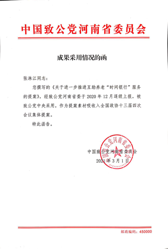 近日,致公党河南省委发来函件,我校致公党党员张淋江老师撰写的《关于进一步推进互助养老“时间银行”服务的提案》被致公党中央采用,作为提案素材吸收入全国政协十三届四次会议集体提案。