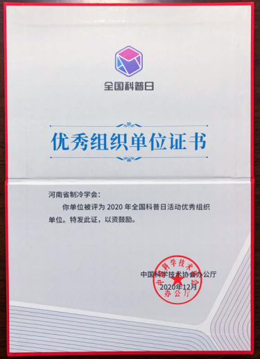 根据《中国科协 中央宣传部 教育部科技部 水利部 农业农村部 国家卫生健康委 应急管理部关于举办2020年全国科普日活动的通知》精神,近日,中国科协对2020年全国科普日有关组织单位和活动进行表彰,挂靠我校的河南省制冷学会获“2020年全国科普日活动优秀组织单位”荣誉。