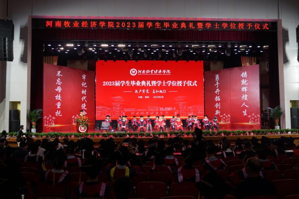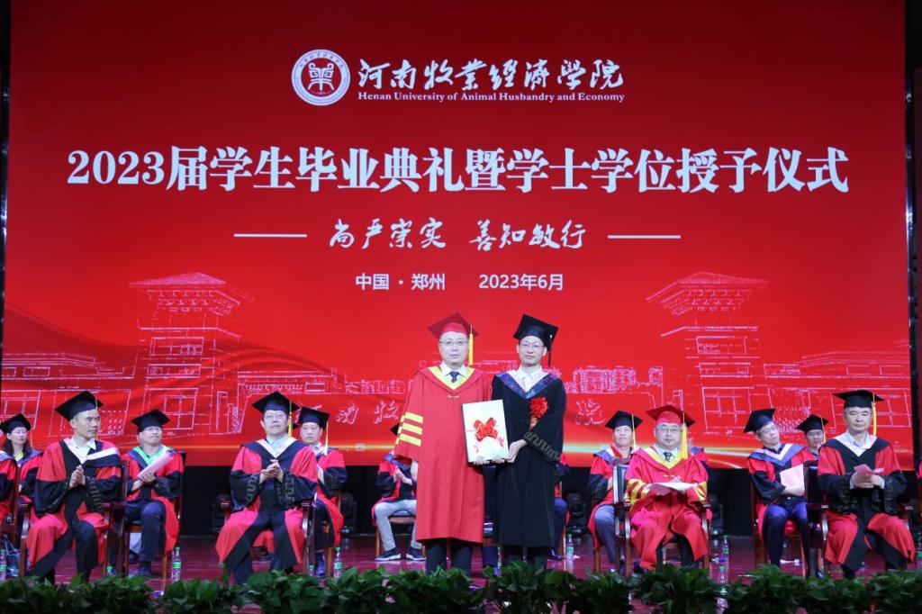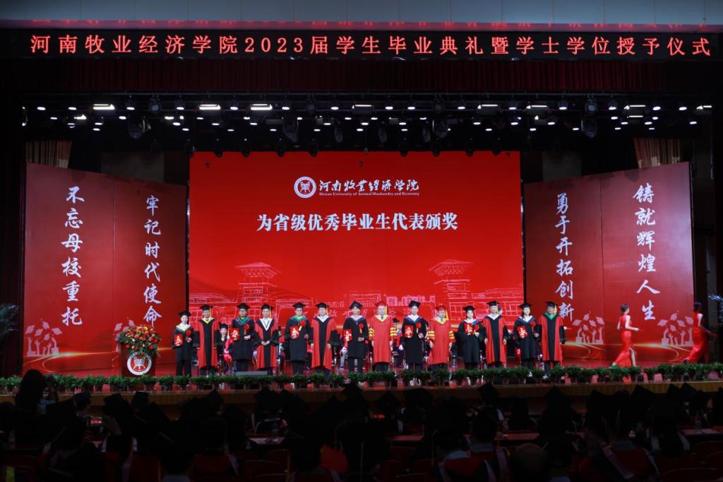 毕业典礼上,校党委副书记李俊杰宣读了我校荣获2023年河南省优秀应届大学毕业生名单;副校长杨国宇宣读了《关于授予贾峥等5820名2023届普通本科毕业生学士学位的决定》;与会校领导分别为毕业生代表颁发毕业证、学位证,拨穗正冠;为省级优秀毕业生代表颁发荣誉证书;为考取研究生、西部计划、参军入伍等优秀毕业生代表颁发奖金;为全体毕业生代表赠送了毕业纪念品。