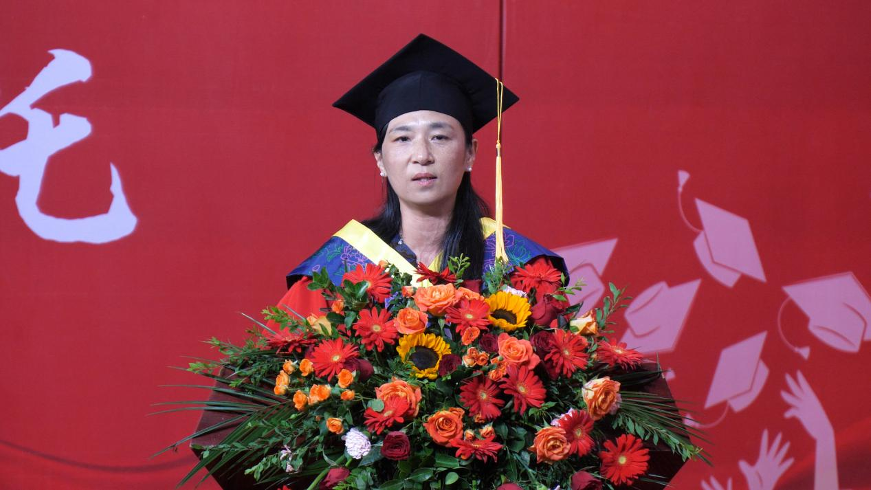 包装与印刷工程学院院长张岩教授作为教师代表发言。她希望同学们脚踏实地、志向高远,坚韧不拔、追求卓越,热爱生活,宽容自信。并祝愿同学们鹏程万里、前程似锦!