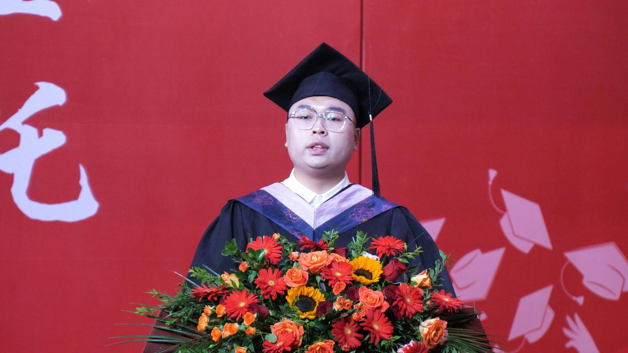 经济与贸易学院19经贸03班韩佳郴同学作为优秀毕业生代表发言。他表示将秉承“尚严崇实 善知敏行”的校训精神,用牧经学子的激情与热情去奉献社会,在实现伟大中国梦的实践中绽放青春光彩。
