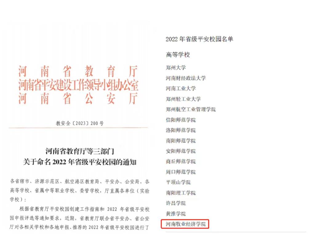 近日,河南省教育厅、河南省平安建设工作领导小组办公室、河南省公安厅联合下发《河南省教育厅等三部门关于命名2022年省级平安校园的通知》(教安全〔2023〕200号文),我校被命名“2022年省级平安校园”,有效期三年。