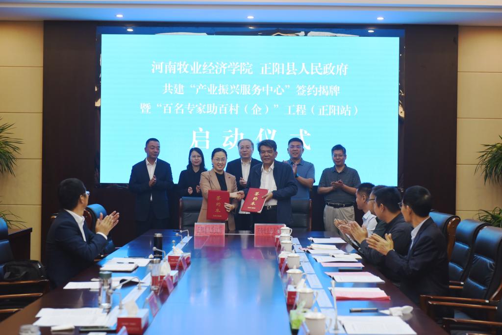 为强力推进“百名专家助百村(企)”工程(“双百”工程)深入实施,积极助力地方产业高质量发展与乡村振兴,9月27日,我校与正阳县人民政府共建“产业振兴服务中心”签约揭牌暨“双百”工程(正阳站)启动仪式在正阳县文体中心隆重举行。校党委书记穆瑞杰、副校长杨国宇及正阳县委副书记、县长张燕出席仪式。校、政、企20多家单位领导和专家代表参加签约仪式。正阳县委常委、宣传部部长、副县长焦中丽主持仪式。