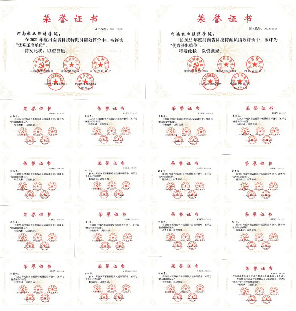 近日,中共河南省委组织部、河南省科学技术厅、河南省财政厅、河南省人力资源和社会保障厅、河南省乡村振兴局联合下达了《关于公布2021、2022年度河南省科技特派员绩效评价结果的通知》(豫科〔2023〕67号)文件,我校在2021、2022年度河南省科技特派员绩效评价中,连续两年度喜获“优秀派出单位”荣誉,河南省观赏鱼养殖产业科技特派员服务团获2021年度“优秀产业科技特派员服务团”,15名科技特派员被评为“优秀科技特派员”。