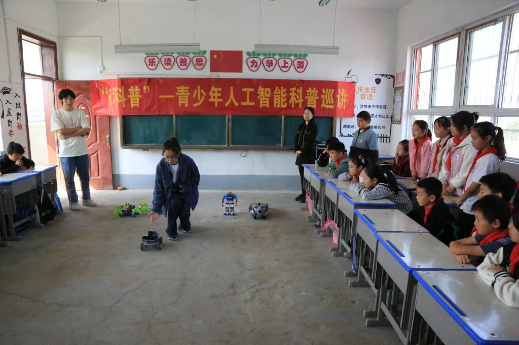 与此同时,一场别开生面的科普活动在大马庄村小学精彩上演。能源与智能工程学院的师生志愿者在王硕院长带领下,通过人工智能基础知识讲解、人工智能产品现场演示和互动问答畅想未来等环节在青少年的心中种下科学的种子,现场演示了仿生蜘蛛六足机器人、麦克纳姆轮Ros智能小车、机器狗和人形舞蹈机器人等人工智能产品,并邀请孩子们上台进行操作,激发了孩子们学习科学知识、追求科技创新的兴趣,培养了他们科技创新的意识,让科学的种子植根心中,形成热爱科学,崇尚科学的良好氛围。