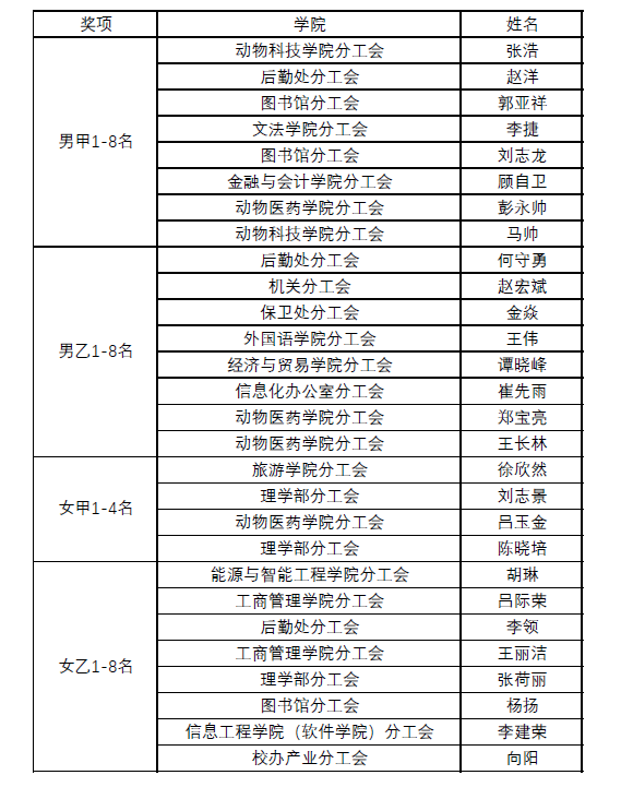经过激烈的角逐,四个组别均评选出前四名优秀选手,其中,动物科技学院分工会张浩、后勤处分工会何守勇、理学部分工会刘志景、能源与智能工程学院分工会胡琳分别荣获男子甲组、男子乙组、女子甲组、女子乙组第一名(全部获奖名单附后)。
