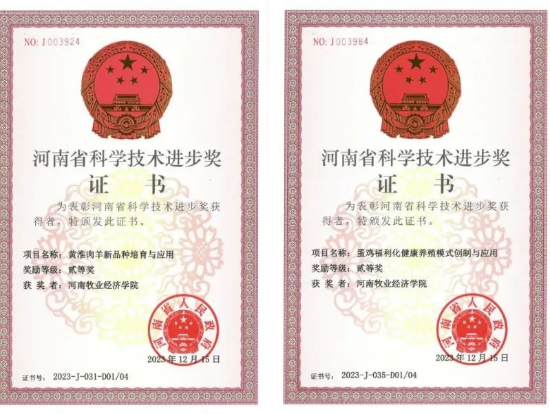 2023年度河南省科学技术奖共评出省自然科学奖、省技术发明奖、省科学技术进步奖授奖项目329项。我校副校长席磊教授主持的《蛋鸡福利化健康养殖模式创制与应用》项目、动物科技学院权凯教授主持的《黄淮肉羊新品种培育与应用》项目均荣获河南省科学技术进步奖二等奖。近年来,我校党委深入落实新时代人才工作新理念新战略新举措,着力打造爱国奉献的高层次人才队伍。学校大力实施人才强校战略,完善了一系列奖励激励政策机制,积极推进科技领域“放管服”改革,持续激发科技创新活力,不断加强学校内涵建设,持续推动学校事业高质量发展。此奖项的获得将进一步助推我校人才强校战略的落地,为全面提升我校的整体科研水平、科技创新能力和核心竞争力奠定坚实的基础。