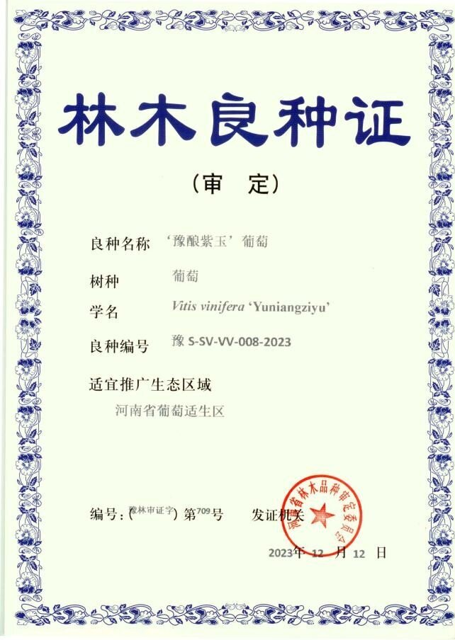 由我校为第一完成单位、我校教师王鹏老师主持选育的酿酒葡萄新品种‘豫酿紫玉’,通过河南省林木品种审定委员会审定,获河南省林木良种,在河南省葡萄适生区及与其相似其他葡萄适生区进行推广。‘豫酿紫玉’的选育工作自2005年开始,历经18年杂种育苗、大田栽植、初选优株、育苗复选、定选、区试、决选、酿酒等过程。该品种是我省首个通过杂交育种的方法获得的酿酒葡萄良种,填补了本土优质酿酒葡萄新品种的空白,摆脱了长期以来对国外酿酒葡萄品种的依赖。该品种的审定和推广,不仅提高了我校的知名度和社会影响力,也为推进河南省酿酒葡萄产业的发展、豫酒振兴战略的实施、高质量发展建设现代化河南具有现实和深远的意义。