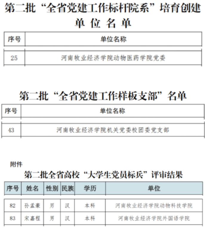 近日,省委教育工委公布了第二批全省高校党建工作强基引领“三级联创”和2023年度“大学生党员标兵”评选结果。我校动物医药学院党委获批第二批“全省党建工作标杆院系”,校团委党支部获批第二批“全省党建工作样板支部”,动物科技学院学生党员孙孟豪、外国语学院学生党员宋嘉程荣获全省高校“大学生党员标兵”称号。