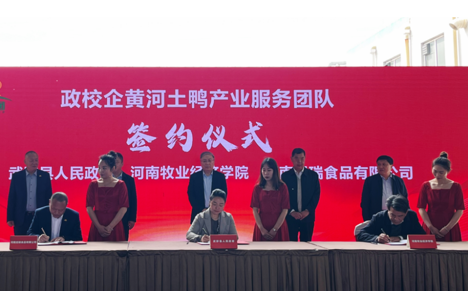 4月8日上午,我校与武陟县人民政府、河南旭瑞食品有限公司共建“黄河土鸭”产业服务团队签约仪式暨“第四代”冻鲜鸭血新品发布会在武陟县隆重举行。校党委书记穆瑞杰、副校长杨国宇,中国食品工业协会副会长、河南省食品工业协会常务副会长陈振杰,河南省食品工业协会秘书长牛景红,焦作市农业农村局局长宋振宇,武陟县县委、县政府领导,相关乡镇、企业负责人及我校相关职能部门、食品与生物工程学院负责同志参加仪式和发布会。