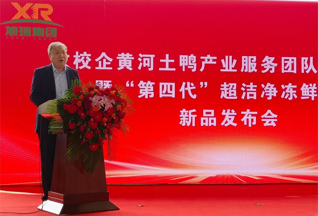 穆瑞杰在致辞中指出,习近平总书记提出的“新质生产力”,为我们在新发展阶段打造经济发展新引擎、增强发展新动能和构筑国家新优势提供了重要指引。黄河土鸭产业服务团队的共建是校政企同向发力的结果,“第四代”超洁净冻鲜鸭血新品的发布是多方同题共答的结果,是政策、产业、科技、人才等各方资源优势充分共享的结果。希望校政企继续深入实施 “双百”工程,创新政产学研合作机制,优化“政府+产业服务团队+龙头企业”服务合作模式,推动新质生产力快速形成,助力河南旭瑞食品有限公司提质增效以及黄河土鸭产业高质量发展,为武陟乡村振兴提供更好的人才与科技支撑。