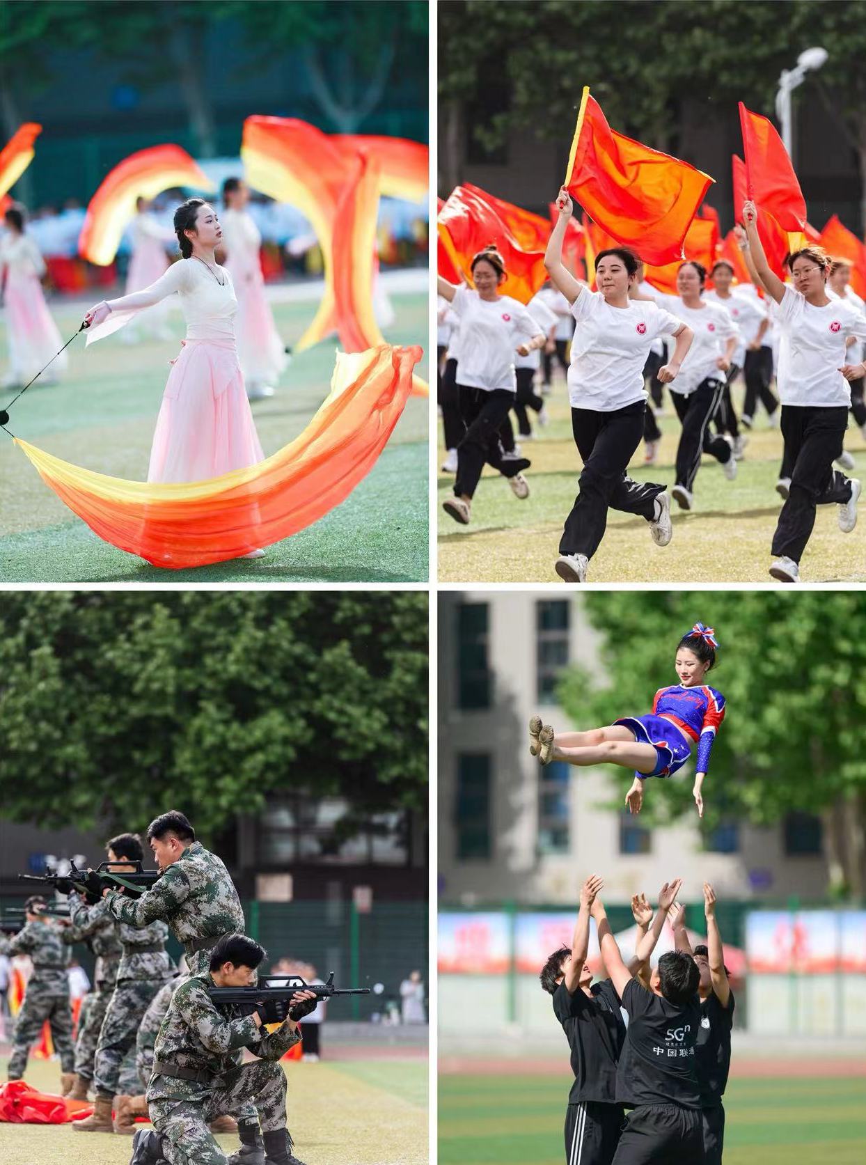 开幕式上,精彩的文体表演分外吸睛。“旗舞飞扬”以中华文化为底蕴,将国旗、校旗与五环元素巧妙地融为一体,缓缓呈现的五环展现出了浓厚的爱国情感与青春活力。最后呈现的“中国75”字样将表演推向高潮,这是对祖国75周年的深情献礼,也彰显了我校师生的爱国情怀。“彩带舞”伴随着优美的旋律闪亮登场,彩带迎风扬,恰似惊鸿舞。她们扬起笑容,舞动彩带,用最美的青春,展示牧经风采。啦啦操表演把现场师生的热情点燃,铿锵的舞步,激昂的节奏,溢满青春与活力,展现出学校师生昂扬向上、奋发进取的精神面貌。