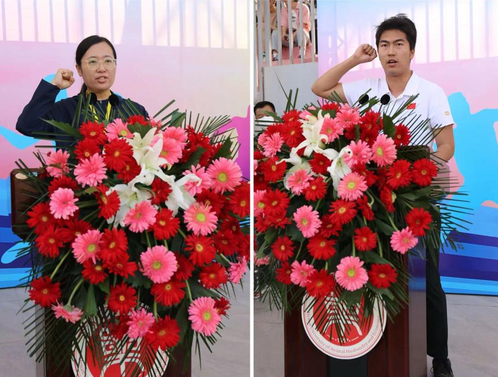 体育部教师张仝、动物医药学院学生运动员王思鑫分别代表裁判员和运动员宣誓。