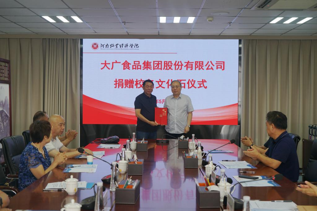 党委办公室、校长办公室、校友工作办公室及动物科技学院、动物医药学院、食品与生物工程学院等相关院(部)负责人及教师代表,我校校友代表、郑州君聚商贸有限公司总经理段文斗,大广食品集团股份有限公司相关负责人参加了捐赠仪式。(霍永/文 吕元贞 赵昱/图)