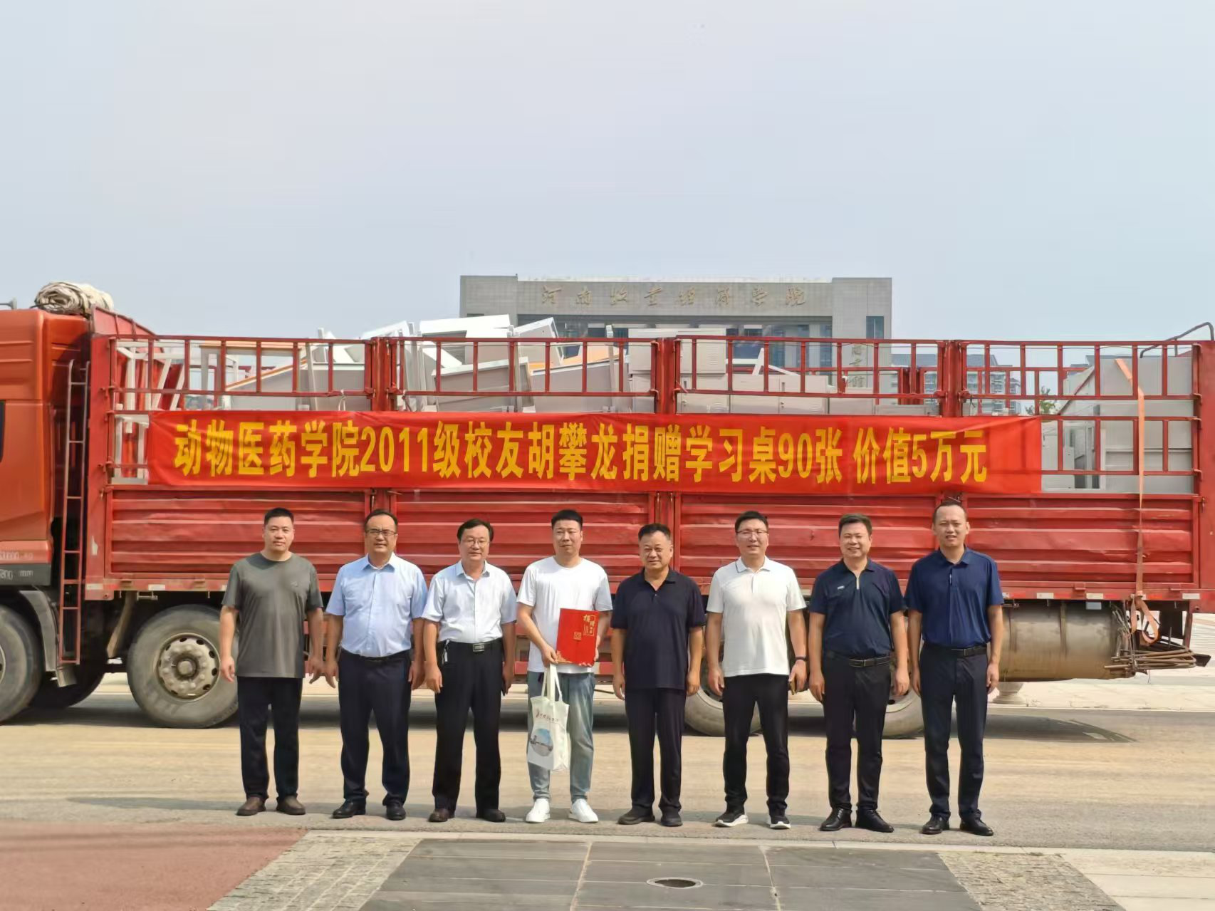 8月25日,我校动物医药学院2011级兽医医药班校友、臻远(河南)家具有限公司总经理胡攀龙向母校捐赠90套学习桌。副校长席磊出席捐赠仪式并向胡攀龙颁发捐赠证书。