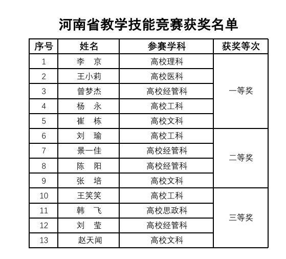 日前,从河南省总工会、河南省教育厅联合下发的《关于河南省教育系统2024年度教学技能竞赛获奖情况的通报》(豫工文〔2024〕89号)中获悉,我校教师在2024年全省教学技能竞赛中荣获5个一等奖、4个二等奖、4个三等奖的优异成绩。