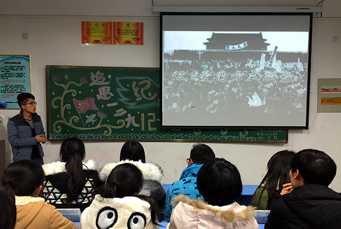 各院(系)也通过精彩纷呈的团课活动,在寓教于乐中使“一二·九”精神扎根于青年学生心中。 动物科技学院通过播放视频、PPT等方式为同学们详细介绍“一二·九”爱国运动历史事件;农林经济管理学院发起“铭记历史·青春传承” 等微博话题讨论;生物工程学院通过在学生中开展红歌赛、青春诗会、重温入团誓词的方式让学生重温历史,培养家国情怀;旅游管理系、自动化与控制系等继承传统,通过朗诵、合唱、专题讨论等团课形式,引导同学纷纷走上讲台,在抚今追昔中慷慨抒怀。