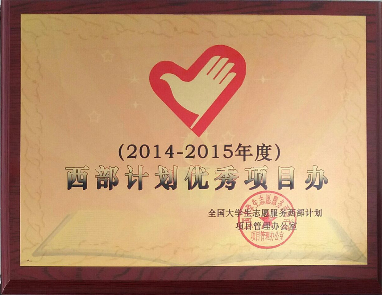 日前,从共青团中央传来喜讯,根据全国项目办发〔2015〕1032号文件,由共青团中央、全国大学生志愿服务西部计划项目办共同组织开展的2014-2015年度西部计划绩效考核工作中,我校荣获“全国西部计划优秀项目办”荣誉称号。