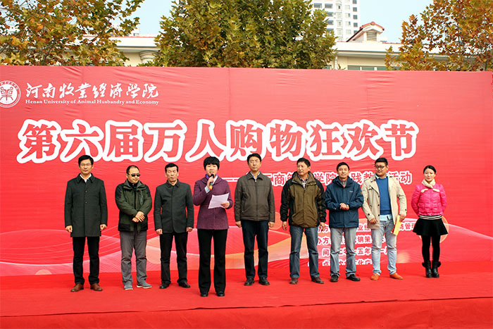 工商管理学院院长王桂朵发表了热情洋溢的致辞,参展商代表河南威尔克姆信息技术有限公司项目经理马振伟代表全体商户对校方举办此次活动表示了诚挚的感谢,工商管理学院党总支书记贾江宣布第六届万人购物狂欢节开幕。