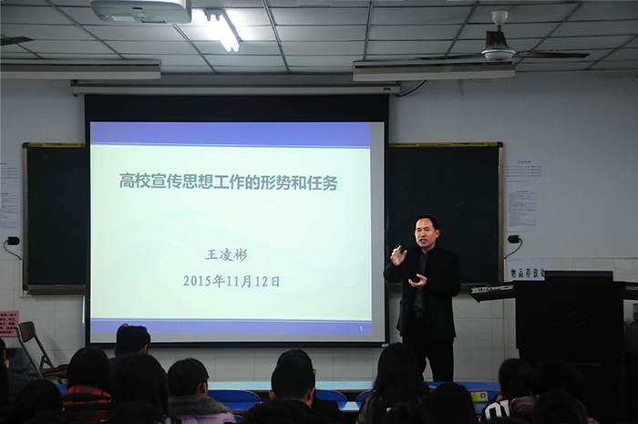 在培训中,党委宣传部部长王凌彬全面分析了高校宣传思想工作的形势和任务,对学校宣传思想工作提出:提高辨别力,弘扬主旋律;传播正能量,站稳主阵地;跟上时代步伐,建立互联网思维的总体要求,并希望宣传思想战线的同志们要树立从大势出发,借势而为的理念;要有底线思维,应对难解问题的能力;运用法治思维,提高依法治理能力;建立全媒体宣传的框架,实现宣传工作的全覆盖。