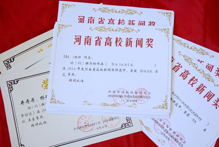 近日,2014年“河南省高校新闻奖”评选结果揭晓,我校成绩喜人,13篇作品获 “河南省高校新闻奖”,其中一等奖1项,二等奖7项,三等奖5项。