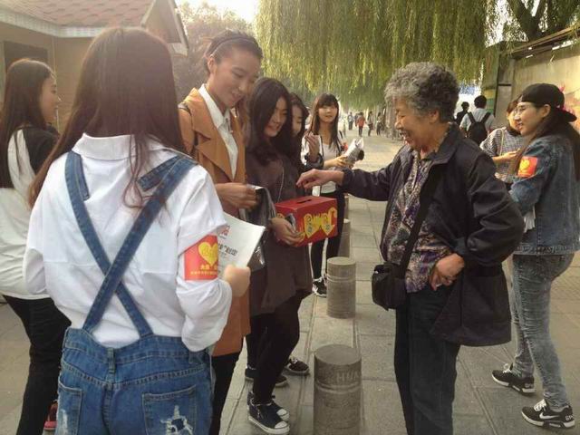 自动化与控制系2015级图形图像制作班团支书李丹阳同学在街头义卖大河报募集善款
