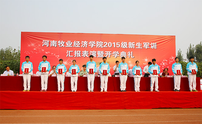 党委书记王保国代表学校为承训部队赠送锦旗。党委副书记、副校长曾照烨在部队教官的陪同下检阅了新生军训方阵。“同学们好!”“同学们辛苦了!”,这声声问候,同学们如沐春风;“校长好!”“为学校争光”,这铿锵有力的口号,回荡校园。副校长许圣道宣读了《关于表彰2015级新生军训先进方阵和先进个人的决定》,决定授予动物科技学院畜牧兽医1班等41个方队为“2015级新生军训先进方阵”,李岩岩等583名同学为“2015级新生军训先进个人”。学校领导和部队首长为获奖的集体和个人颁奖。