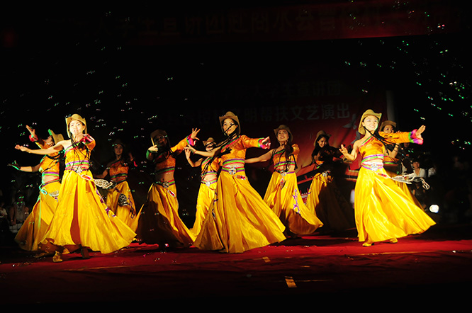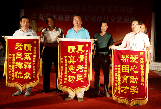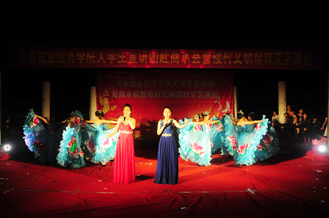 晚上8点,文明帮扶文艺演出正式拉开帷幕。演出现场,上千村民热情高涨,大学生动听的歌曲、优美的舞蹈和曾楼村老人、孩子们的精彩表演赢得了阵阵热烈的掌声。舞蹈《踏歌起舞》、《雨中花》、《奔袭》和《溜溜的康定溜溜的情》看得观众目不转睛,歌曲《报答》、《常回家看看》、《共圆中国梦》和豫剧《府门外三声炮花轿起动》、《祖国的大建设一日千里》听得村民们如痴如醉,17个节目持续2个多小时的演出给村民了带精彩的艺术享受。演出结束后,一位老大爷激动地说:“一辈子也没见过这么好的节目,今天真是开了眼了,我们农民也享受城里人的待遇了,真是太好了!”