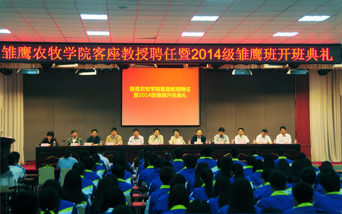 本网讯 5月9日上午,我校雏鹰农牧学院客座教授聘任仪式暨2014级雏鹰班开班典礼在龙子湖校区大学生活动中心举行。院党委副书记、副院长曾照烨,副院长张卫宪,北林校区管委会主任杨宝进,发规办及各相关系部负责人出席会议,2014级雏鹰班班主任和全体学生共250多名师生参加了会议。雏鹰农牧集团总裁李花、培训中心副总经理刘高峰、副董事长助理袁卫国参加了开班典礼。