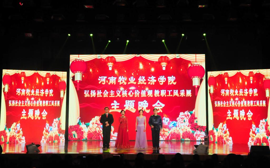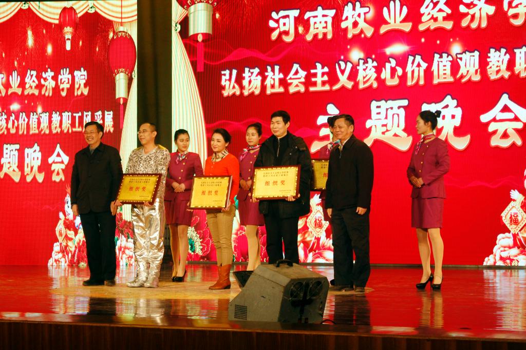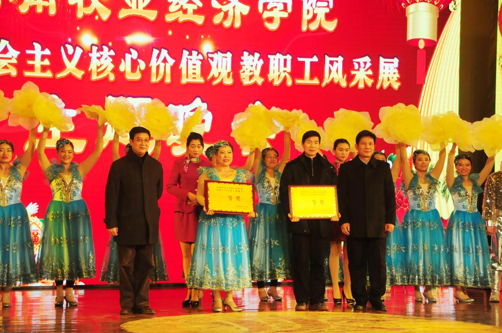 1月15日下午,英才校区大礼堂华灯绽放、流光溢彩,我校2015“弘扬社会主义核心价值观教职工风采展”主题晚会在这里隆重举行。校领导王保国、李明中、曾照烨、李绍文、张卫宪、许圣道、陈艳、荆其增、田留栓,和组织统战部部长仝方存、龙子湖校区管委会主任王建昌等职能部门负责同志出席晚会并为获奖者颁发了奖牌。校领导、离退休职工和各院系师生1000多人共同享受了一场“视觉盛宴”。