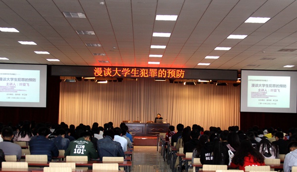 上午9点,为了提升大学生对法律的认识和灵活运用能力,校党委宣传部、学工部特别邀请了河南财经政法大学副教授、郑州仲裁委员会仲裁员、河南法学会经济法学会理事、律师叶亚飞,在龙子湖校区大学生活动中心举办了“漫谈大学生犯罪的预防”专题讲座,约500名师生参加专题讲座。