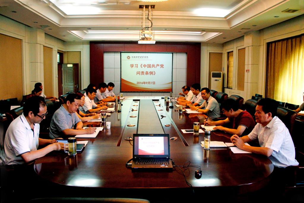9月7日上午,学校在英才校区召开党委理论学习中心组会议,专题学习《中国共产党问责条例》(以下简称《问责条例》)。校领导王保国、曾照烨、李绍文、张卫宪、许圣道、张伟、陈艳、程慎、荆其增、田留栓及中心组其他成员、相关部门负责人参加了学习。会议由校党委书记王保国主持。
