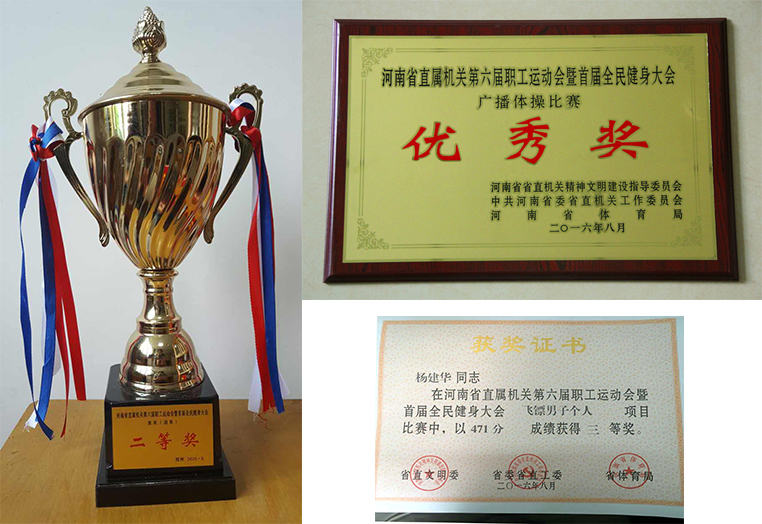 拔河比赛奖杯、广播体操比赛奖牌、杨建华老师荣誉证书