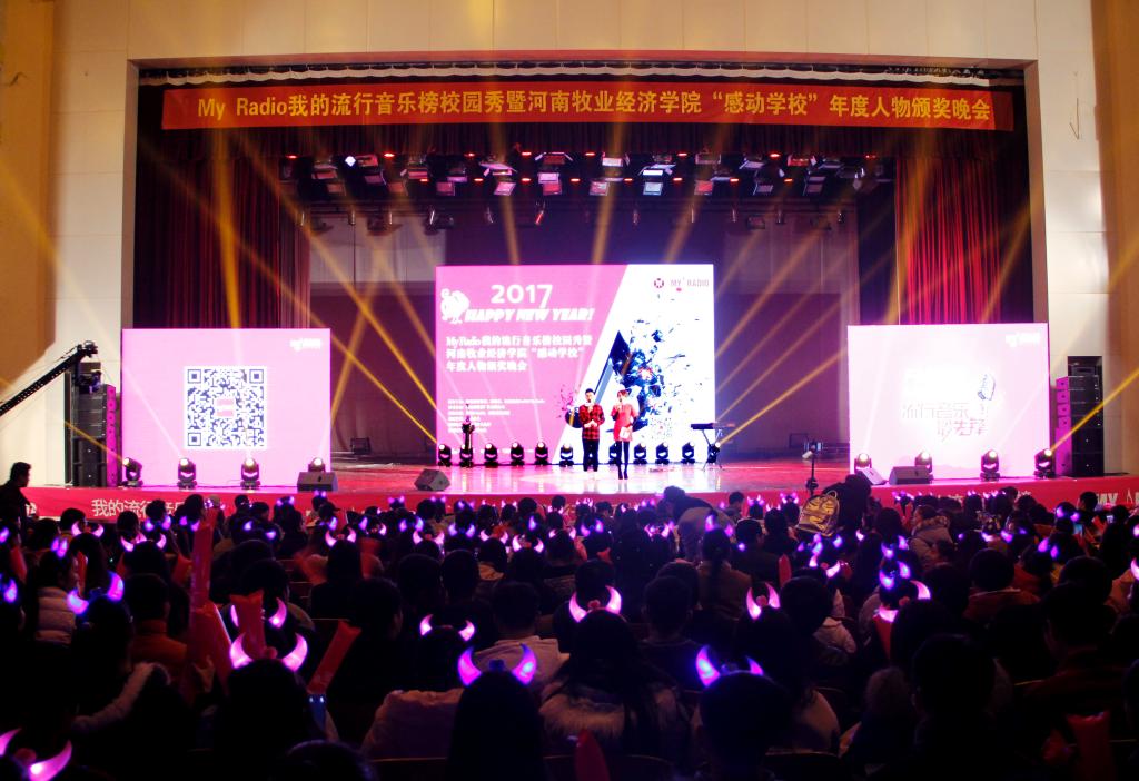 本次活动是由我校党委宣传部、团委携手河南电台FM90.0 My Radio联合举办的一场既青春激昂又温情洋溢的迎新年音乐晚会。伴随着流光溢彩的舞台灯光和高品质的音响效果,10位在全校范围内精心选拔并经过专业培训的优秀校园歌手依次登场,《不为谁而作的歌》、《全世界谁倾听你》、《一次就好》、《浮夸》、《彩虹》等一首首脍炙人口、深受青年学生喜爱的歌曲一次次将现场1300余名师生的激情点燃,荧光棒、闪光灯交相辉映,掌声、喝彩声此起彼伏,台上台下交汇成了一片欢乐的海洋。