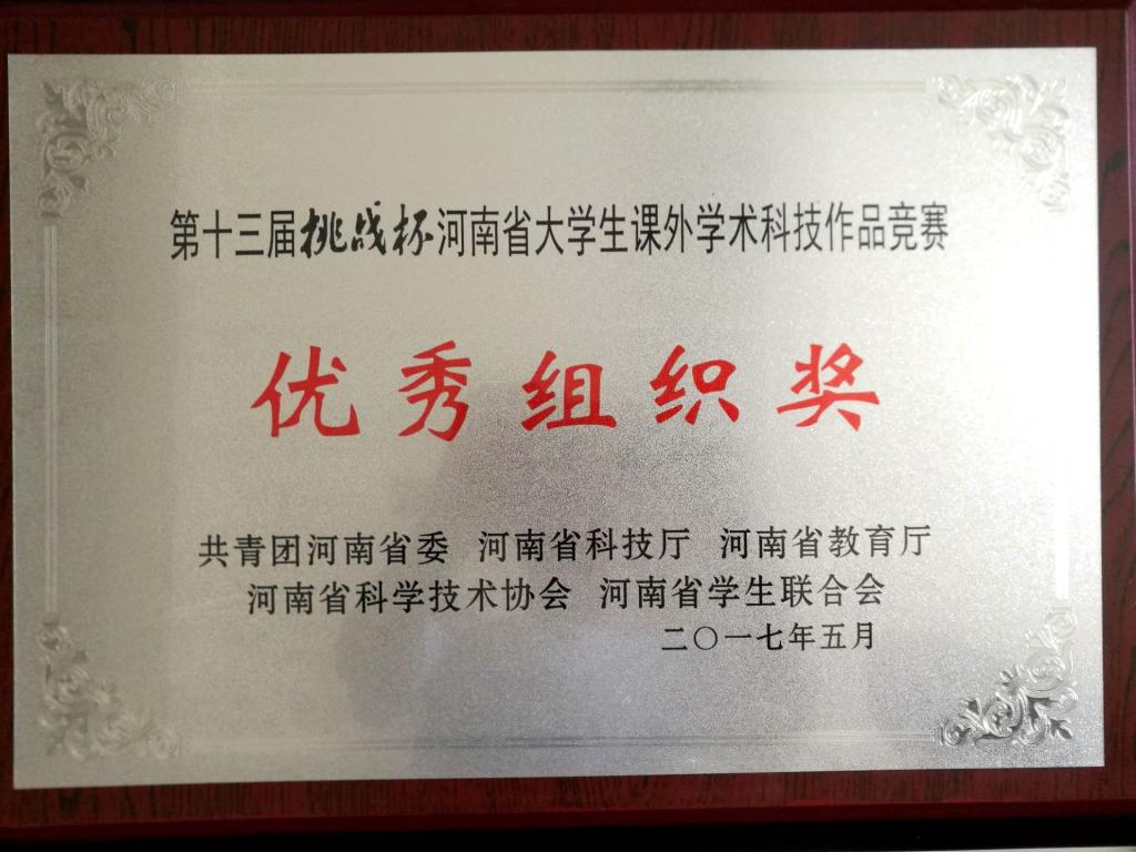 近日,由团省委、省科技厅、省教育厅、省科协、省学联共同主办的第十三届“挑战杯”河南省大学生课外学术科技作品竞赛成绩揭晓,我校选送的科技制作类作品《池塘捕虫消毒宝》荣获一等奖,科技制作类作品《基于微酸性电解水的畜禽舍排气除氨塔》,论文类作品《响应面法优化牛排无磷保水条件的研究》、《白头翁散超微粉的质量标准研究》荣获二等奖,另有16件作品荣获三等奖,学校再次荣获大赛“优秀组织奖”。