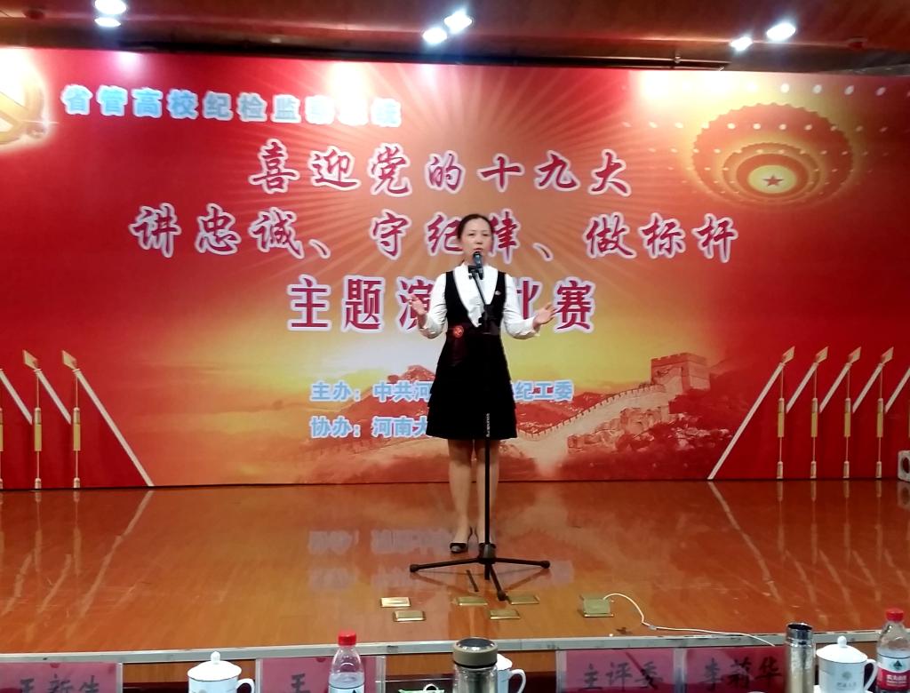 9月4日至6日,省高校纪工委主办的省管高校纪检监察系统“喜迎党的十九大,讲忠诚、守纪律、做标杆”主题演讲比赛活动在河南大学举行,我校选手胡蕾同志以《敬业担当、做忠诚纪检干部》为题,论述了作为一名纪检监察干部应具备的理想信念、敬业精神和责任担当,分享了我校40多名纪检监察干部在学校转型发展时期,坚守岗位、认真履职,践行入党誓词,落实监督执纪“四种形态”的部分感人事迹,展现了新时期我校纪检监察干部对党忠诚、敢于担当、敬业奉献的良好形象。胡蕾同志的演讲主题鲜明、内容充实,表现生动感人,得到了评委和现场观众的一致认可,成绩名列前茅。学校在此次活动中被评为优秀组织奖。