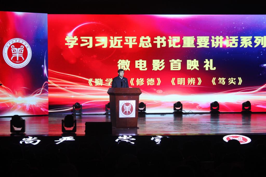 首映仪式上,许圣道对我校师生用新媒体手段引领、服务青年学生给予肯定。他指出,此次“《勤学》《修德》《明辨》《笃实》——学习习近平总书记重要讲话”系列微电影是大学生贯彻习近平总书记系列讲话精神的一项具体实践,希望广大师生把青春智慧和力量凝聚到落实党的十九大提出的各项任务上来,继续不断探索思想政治教育新途径、新方法;希望青年学生勇于追梦,勤于圆梦,积极践行习近平总书记提出的“勤学、修德、明辨、笃实”的八字箴言,用拼搏和奋斗,抒写精彩人生。