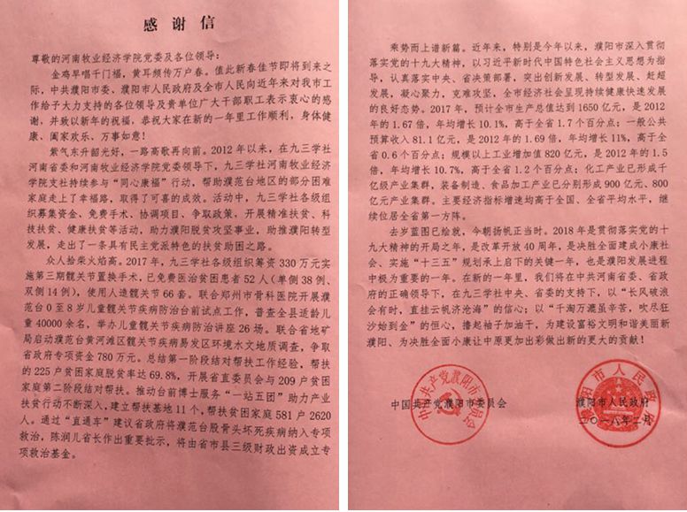 近日,濮阳市委、市政府发来感谢信,对学校党委和九三学社tyc8722太阳集团城支社助力濮阳脱贫攻坚工作表示衷心感谢。