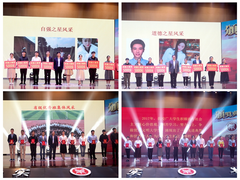 为贯彻全面育人思想,培养我校学生中的优秀拔尖人才,发挥标杆作用,2017年,我校专门设立了学生单项奖,并在全体学生中首次开展了星级人物评选活动。颁奖典礼上,副校长张伟为“十大优秀学生之星”、“十大优秀学生干部之星”和“十大道德之星”颁奖;校纪委书记李中华为“十大技能之星”、“十大创新创业之星”、“十大自强之星”和“十大文化艺术之星”颁奖;副校长许圣道为“十大体育竞技之星”、“十大阅读之星”和“百名学业之星”颁奖。“校园之星”代表了我校学生在不同方面达到的最高水平,颁奖后的情景剧《辅导员谈心谈话》,通过生动有趣的场景再现,深入诠释了学生星级人物评选的重大意义。