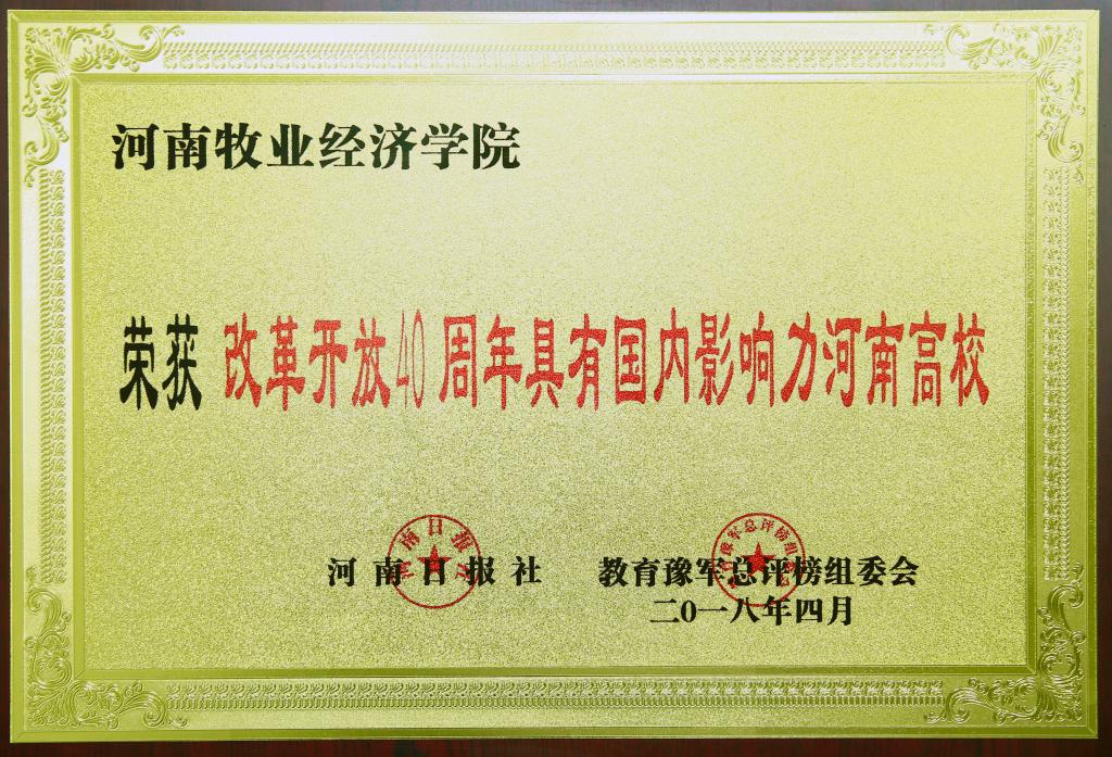 4月26日上午,由河南日报社主办的“第九届河南高等教育领军高校高峰论坛暨2018年度河南教育豫军总评榜”颁奖典礼在河南日报报业大厦举办,论坛发布了“改革开放40周年教育豫军总评榜”并进行了表彰,我校荣获“改革开放40周年具有国内影响力河南高校”。