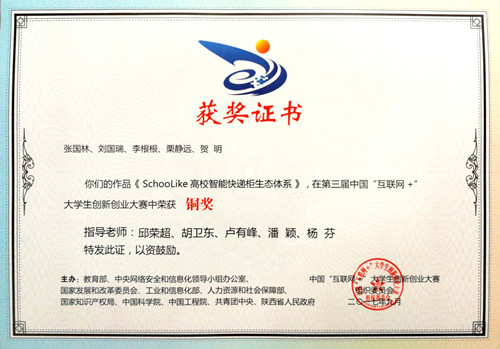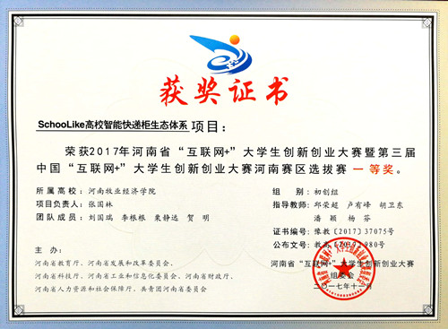 5月25日上午,2018年河南省“互联网+”大学生创新创业大赛工作会议暨“青年红色筑梦之旅”启动仪式在河南科技大学举行,我校动物医学院毕业生张国林带领的大学生创业团队项目“SchooLike高校智能快递柜生态体系”获得全国铜奖,学校大学生创业项目获得省级一等奖2项、二等奖2项、三等奖1项。马霞、汪洋、卢有峰、胡卫东、邱荣超、潘颖、杨芬等七位教师获“优秀创新创业指导教师”荣誉称号。