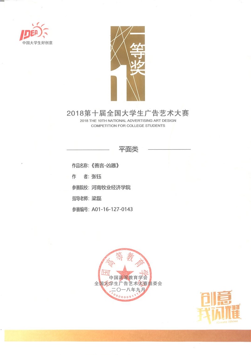 “大广赛”是迄今为止全国覆盖研究生、本科生、专科生,规模最大、人数最多、水准最高的国家级大学生赛事。本届大赛的主题为“创意我闪耀”,在各省、市、自治区、直辖市共设置了29个赛区。在前期已经结束的“大广赛”河南赛区大赛中,我校艺术学院学生参赛成绩喜人,获得全省一等奖1项、三等奖11项、优秀奖28项,梁磊和彭辉两名教师被评为“优秀指导教师”;我校张钰同学的作品《善言凶器》继河南赛区评比中获得一等奖后,在全国总决赛中又从16.7万组平面作品中脱颖而出,获得总决赛平面类全国一等奖。此外,我校还有2名学生参赛作品获得全国优秀奖。