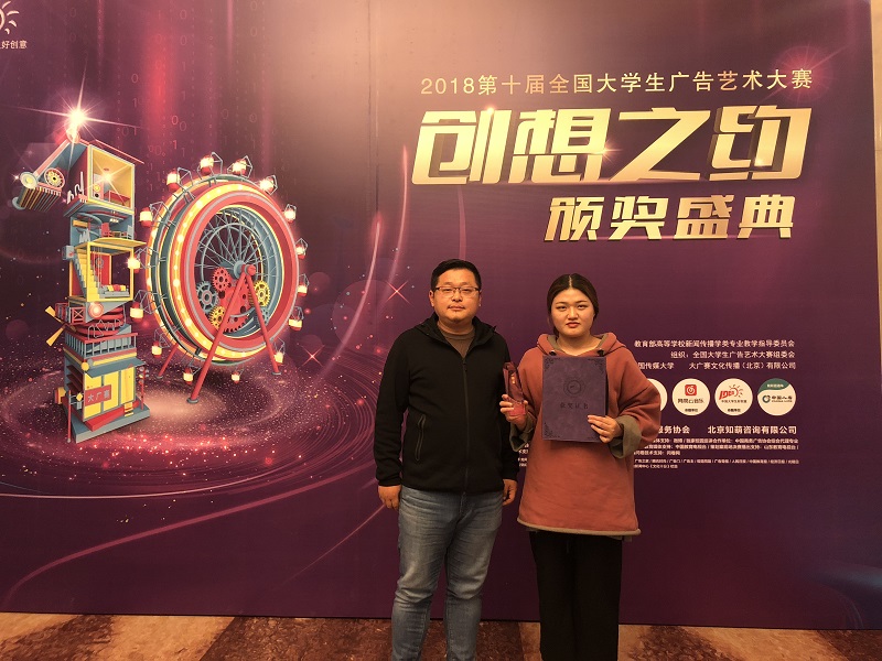 11月24日,由教育部高等教育司主办、教育部高等学校新闻学学科教学指导委员会组织、中国传媒大学与中国高等教育学会广告教育专业委员会共同承办的第十届全国大学生广告艺术大赛(简称“大广赛”)全国总决赛颁奖典礼在北京全国政协礼堂举行,我校艺术学院张钰同学参赛作品荣获总决赛平面类全国一等奖,并应邀和指导老师梁磊一道赴京参加颁奖盛典。