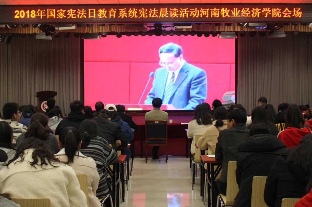 12月4日是我国第5个国家宪法日暨全国第18个法制宣传日,为大力弘扬宪法精神,我校在龙子湖校区大学生活动中心组织参加了2018年全国网络直播“宪法晨读”活动。校党委副书记、工会主席李绍文出席活动,宣传部、团委负责同志,校级学生组织以及各学院学生代表参加了活动。